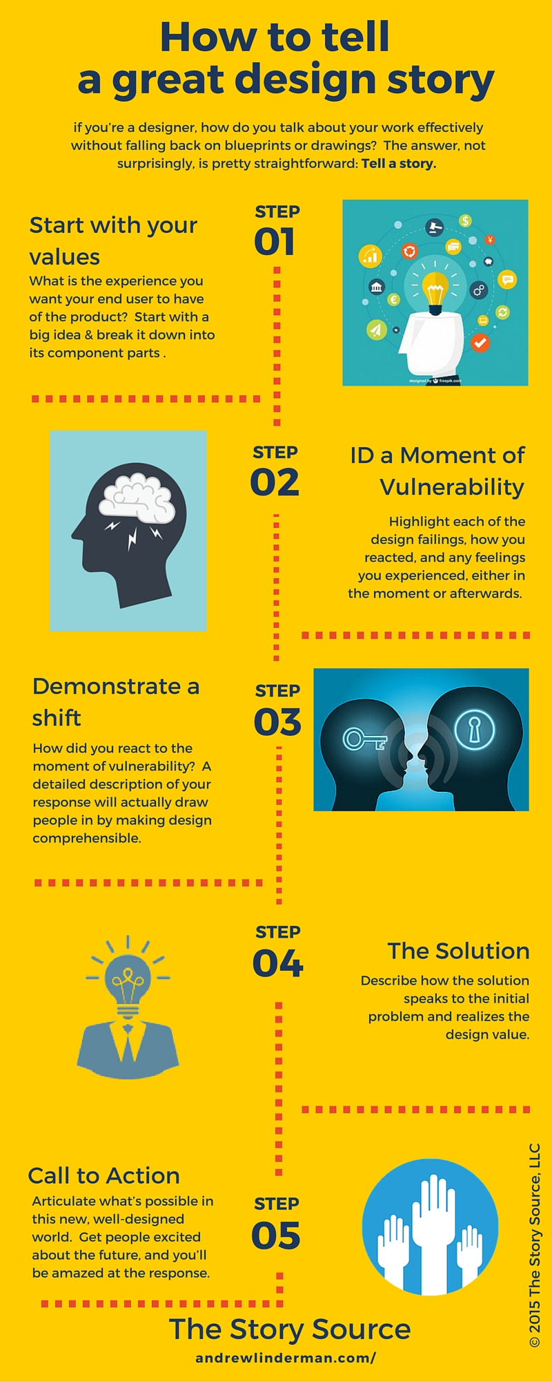 To help you share compelling design stories, here are “5 Steps for Telling a Design Story.”  Check out our handy infographic, follow these guidelines and you’ll have yet another tool for amazing potential clients or fellow designers.